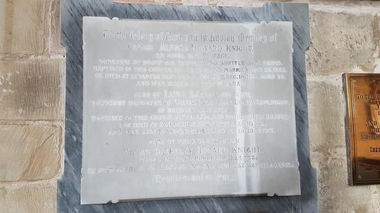 To the Glory of God and in Loving Memory of/ CAPTAIN ALFRED HOWARD KNIGHT,/ 2/5 ROYAL SUSSEX REGT./ SOMETIME OF BOOTH HAY, YEAVELEY AND SHOTTLE GATE FARMS./ BAPTISED IN THIS CHURCH AUG. 25. 1879. AND MARRIED JULY 25. 1882./ HE DIED AT LESSNESS PARK CAMP, WOOLWICH DEC. 10. 1915, AGED 59./ AND WAS BURIED AT EAST WICKHAM/ ALSO OF LUNA LIZZIE, HIS WIFE,/ YOUNGEST DAUGHTER OF WILLIAM AND MARY LOUISA TOMLINSON./ OF BRADLEY PASTURES/ BAPTISED IN THIS CHURCH SEPT. 11. 1864, AND MARRIED JULY 25. 1882,/ SHE DIED AT ASHBOURNE, AUG. 12. 1923, AGED 58,/ AND WAS BURIED WITH HER PARENTS AT IDRIDGEHAY./ ALSO OF THEIR YOUNGER SON/ VIVIAN BERKELEY HOWARD KNIGHT,/ BAPTISED IN THIS CHURCH JUNE 24. 1886./ HE DIED APRIL 20 1917, AGED 30, AND WAS BURIED AT WANSTEAD, ESSEX./ Requiescant in Pace.