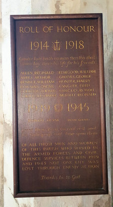 ROLL OF HONOUR / 1914 + 1918 / Greater love hath no man that this that / a man lay down his life for his friends / (Names) / 1939 - 1945 / (Name) / Grant them, Lord, eternal rest and / let light perpetual shine upon them / OF ALL THE MEN AND WOMEN / OF THIS PARISH WHO SERVED IN / THE ARMED FORCES AND CIVIL / DEFENCE SERVICES BETWEEN 1939 / AND 1945 NOT ONE LIFE WAS / LOST THROUGH ENEMY ACTION / Thanks be to God //
