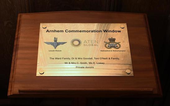Window: (Badges of the Parachute Regiment, 'The Border Regiment', 'The Kings Own Scottish Border Regiment' and 'The South Staffordshire Regiment')/ ARNHEM 1944/ We will remember them Lectern Plaque: Arnhem Commemoration Window/ (Parachute Regiment badge) Lincoln Branch/ ATEN GLOBAL/ (South Staffordshire Regiment badge) Hednesford & Wolverhampton/ (names)/ Private donors