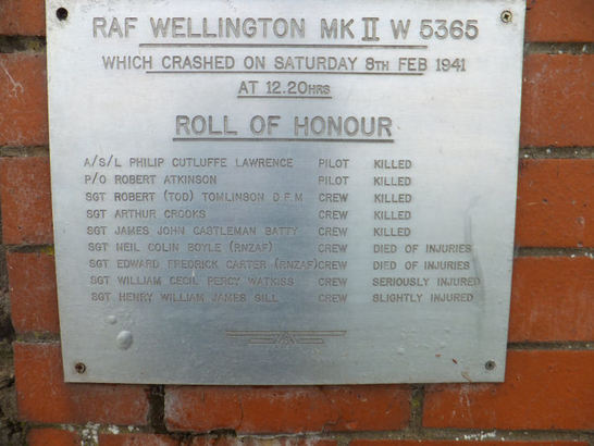 RAF WELLINGTON MKII W5365/ WHICH CRASHED ON SATURDAY 8TH FEB 1941/ AT 12.20HRS/ ROLL OF HONOUR/ (9 Names)