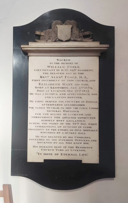 SACRED/ TO THE MEMORY OF/ WILLIAM POOLE/ LIEUTENANT IN H.M'S 84TH. REGIMENT/ THE BELOVED SON OF THE/ REVD. ALEXR. POOLE, B.A.,/ FIRST INCUMBENT OF THIS CHURCH, AND/ ELIZABETH MARY, HIS WIFE,/ BORN AT KEGWORTH, JAN. 4TH, 1834./ DIED AT LUCKNOW, SEP. 29TH, 1857./ HE WAS A DUTIFUL AND AFFECTIONATE SON/ AND A LOVING BROTHER./ HE FIRST SERVED HIS COUNTRY IN BIRMAH,/ AFTERWARDS ACCOMPANIED/ SIR JAMES OUTRAM, TO JOIN THE FORCE UNDER/ GENERAL HAVELOCK/ FOR THE RELIEF OF LUCKNOW, AND/ THROUGHOUT THE ADVANCE CONDUCTED/ HMSELF MOST GALLANTLY./ DURING THE NIGHT OF THE 28TH, SEP, WHEN/ COMMANDING AN OUTPOST IN CLOSE/ PROXIMITY TO THE ENEMY, HE FELL MORTALLY/ WOUNDED BY A MUSKET BALL./ HE WAS BELOVED BY HIS COMRADES,/ ESTEEMED BY HIS SUPERIOR OFFICERS, AND/ MOURNED BY ALL WHO KNEW HIM./ HIS REMAINS REST IN THE RESIDENCY/ CHURCH YARD AT LUCKNOW,/ "IN HOPE OF ETERNAL LIFE."