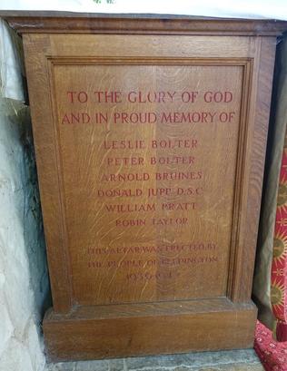 To the Glory of God and in Proud Memory of (Names) This altar was erected by tge people of Bledington 1939-1945