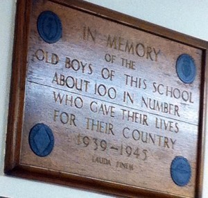IN MEMORY/ OF THE/ OLD BOYS OF THIS SCHOOL/ ABOUT 100 IN NUMBER/ WHO GAVE THEIR LIVES/ FOR THEIR COUNTRY/ 1939 - 1945/ LAUDA FINEM. (Translation: Praise to the end.)