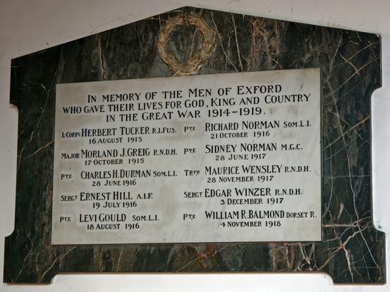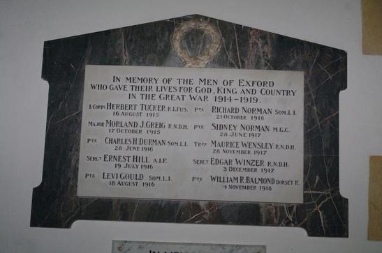 IN MEMORY OF THE MEN OF EXFORD/ WHO GAVE THEIR LIVES FOR GOD, KING AND COUNTRY/ IN THE GREAT WAR 1914 - 1919/ (NAMES)