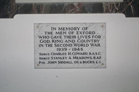 IN MEMORY OF/ THE MEN OF EXFORD/ WHO GAVE THEIR LIVES FOR/ GOD, KING AND COUNTRY/ IN THE SECOND WORLD WAR/ 1939 - 1945/ (NAMES)