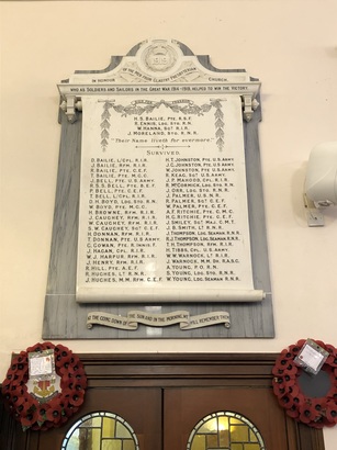 Fallen-H S Bailie Pte R S F/ R Ennis Ldg Sto. R N/ W Hanna Sgt R I R J Moreland Sto. R N R; Served- Column 1- Bailie D Lance Corporal R.I.R./ Bailie J Rifleman R.I.R./ Bailie R Private C.E.F./ Bailie T Private M.G.C./ Bell J Private US Army/ Bell R Private B.E.F./ Bell P Private C.E.F./ Bell T Lance Corporal R.I.R./ Boyd D H Leading Stoker R.N./ Boyd W Private M.G.C./ Browne H Rifleman R.I.R./ Caughey J Rifleman R.I.R./ Caughey W Rifleman R.I.R./ Caughey S W Sergeant C.E.F./ Donnan H Rifleman R.I.R./ Donnan T Private US Army/ Gowan G Private R. Innis. F./ Hagan J Lance Corporal R.I.R./ Harpur W J Rifleman R.I.R./ Henry J Rifleman R.I.R./ Hill R Private A.E.F./ Hughes R Lieutenant R.N.R./ Hughes J MM Rifleman C.E.F.; Column 2- Johnston H T Private US Army/ Johnston J G Private US Army/ Johnston W Private US Army/ Keag R Sergeant US Army/ Mahood J P Corporal R.I.R./ McCormick R Leading Stoker R.N./ Orr J Leading Stoker R.N.R./ Palmer J U.S.N.R./ Palmer R Sergeant C.E.F./ Palmer W Private C.E.F./ Richie A F Private C.M.C./ Ritchie H G Private C.E.F./ Smiley J Sergeant Major C.M.T./ Smith J B Lieutenant R.N.R./ Thompson J Leading Seaman R.N.R./ Thompson R J Leading Seaman R.N.R./ Thompson T H Rifleman R.I.R./ Tibbs T Corporal US Army/ Warnock W W Lieutenant R.I.R./ Warnock J MM Driver R.A.S.C./ Young A Petty Officer R.N./ Young S Leading Stoker R.N.R./ Young W Leading Seaman R.N.R.