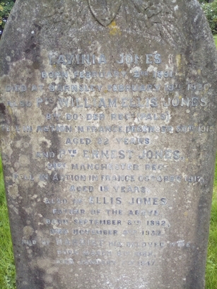 LAVINIA JONES/BORN FEBRUARY 2ND 1891/DIED AT BARNSLEY FEBRUARY 19TH 1920/ALSO PTE WILLIAM ELLIS JONES/8TH BORDER REGT (PALS)/FELL IN ACTION IN FRANCE DECEMBER 30TH 1915/AGED 22 YEARS/AND PTE ERNEST JONES/21ST MANCHESTER REGT/FELL IN ACTION IN FRANCE OCTOBER 1917/AGED 18 YEARS/...