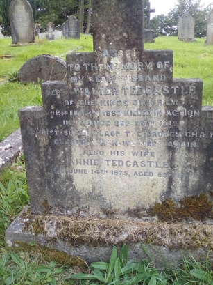 SACRED/TO THE MEMORY OF/MY DEAR HUSBAND/SERGT WALTER TEDCASTLE/OF THE KINGS OWN R.L.R./BORN FEB. 25TH 1882 KILLED IN ACTION/IN FRANCE SEP. 20TH 1917/CHRIST SHALL CLASP THE BROKEN CHAIN/CLOSED WHEN WE MEET AGAIN/ALSO HIS WIFE/ANNIE TEDCASTLE/DIED JUNE 14TH 1975, AGED 89 YEARS