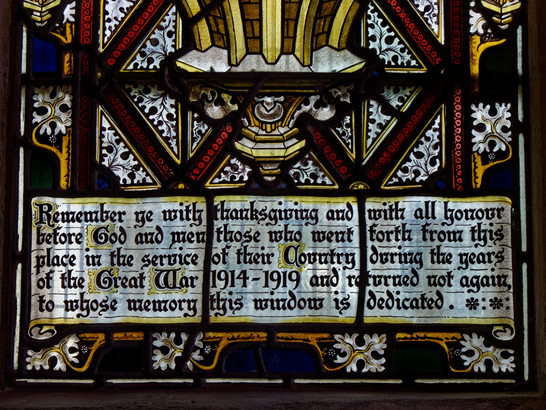 Remember ye with thanksgiving and with all honour/before God and men those who went forth from this/place in the service of theior Country during the years/of the Great War 1914-1919 and returned not again,/to whose memory this window is dedicated.