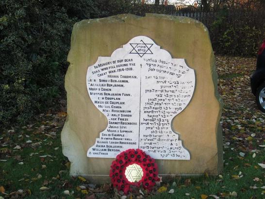 At top centre Hebrew lettering within Star of David translates as "An Everlasting Memorial" Left column: IN MEMORY OF OUR DEAR/ SONS WHO FELL DURING THE/ GREAT WAR 1914-1918/ (20 Names) Right hand column: Hebrew lettering translation and Hebrew given names.
