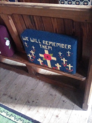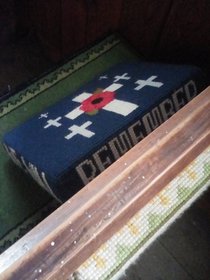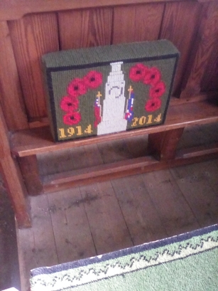 Hassock 1- 1914 2014; Hassock 2-WE WILL REMEMBER/THEM; Hassock 3-Left Hand Face- WE WILL; Front Face- REMEMBER; Right Hand Face- THEM