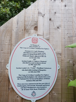 In memory of/three members of the corps of/ (civilian) Canadian fire fighters:/ Fireman J.S. Coull (Winnipeg)/who died as a result of enemy action/when a V1 flying bomb fell on part of/Wildcroft Manor, adjacent to this site/on 3rd July 1944,/ also/ section leader A. Lapierre (Montreal)/who died in a road accident in Bristol/on 30th April 1943,/and/section leader L.E. ("Curly") Woodhead (Saskatoon)/who died while training in Hampshire/ on 16th June 1944./ The corps of (civilian) Canadian fire fighters/comprised 406 firefighters who volunteered to assist/the National Fire Service in the defence of Britain/between 1942 and 1944./ These men were stationed in the four port cities of/Southampton, Portsmouth, Plymouth and Bristol/and their headquarters were located at/10-14 Inner Park Road, Wimbledon.