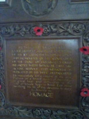 IN THANKFUL MEMORY OF/ MAJOR HERBERT AUGUSTINE CARTER VC/ OF THE 101ST GRENADIERS, INDIAN ARMY/ AND IN HONOUR OF HIS COMRADES/ OF THE DUKES OF CORNWALL'S LIGHT/ INFANTRY WITH WHOM HE FIRST SAW/ ACTIVE SERVICE THIS MEMORIAL IS/ DEDICATED BY HIS WIFE HELEN CARTER/ HE SUCCESSFULLY LED A COLUMN OF THE 40TH/ PATHANS ON A FORCED MARCH OF TWO DAYS/IN GREAT HEAT AND DIFFICULTIES TO THE/ RELIEF OF THE MWELE NOGO IN BRITISH EAST AFRICA/SACRIFICING HIS LIFE IN THIS DEVOTION TO DUTY/13TH JANUARY 1916/ HOMAGE