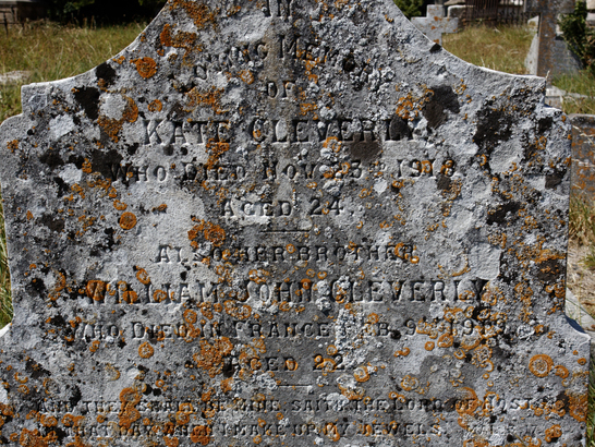 ALSO HER BROTHER/WILLIAM JOHN CLEVERLY/WHO DIED IN FRANCE FEB 9TH 1919/AGED 22/"AND THEY SHALL BE MINE, SAITH THE LORD OF HOSTS,/IN THAT DAY WHEN I MAKE UP MY JEWELS" MAL 3.17