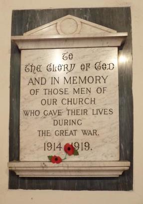TO/ THE GLORY OF GOD/ AND IN LOVING MEMORY/ OF THOSE MEN OF/ OUR CHURCH/ WHO GAVE THEIR LIVES/ DURING/ THE GREAT WAR/ 1914-1919