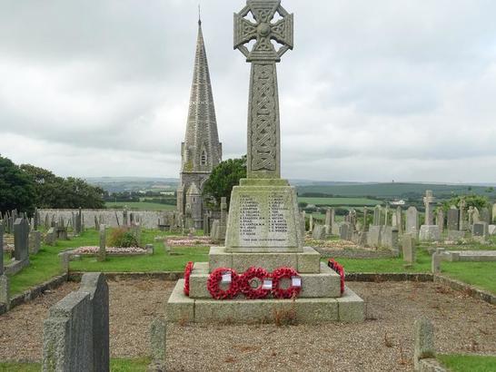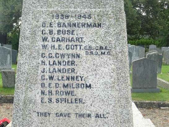 WW1- Column 1- F Buse/ G H Buse/ F F Campbell/ E H Carhart/ J Champion/ R B Collings/ J L Collings/ H Craddock MM/ A Craig/ R C Hawken MM/ W C Heard/ F Hoare/ J P Hoare; Column 2- R Kellow/ J L Mably/ S H Mably/ A Male/ R Roseveare/ S Tom/ J Waters/ H Waters/ R E B White/ E M Worden/ F C Worden/ S H Worden; WW2- D E Bannerman/ G B Buse/ W Carhart/ W H E Gott C.B. C.B.E. D.S.O. M.C./ C G Gwynn/ H Lander/ J Lander/ G W Lenney/ D E D Milsom/ N H Rowe/ E S Spiller