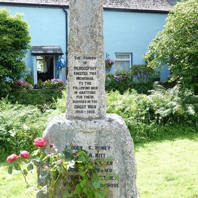 THE PARISH/ OF/ HERODSFOOT/ ERECTED THIS/ MEMORIAL/ TO THE FOLLOWING MEN/ IN GRATITUDE/ FOR THEIR/ SERVICES IN THE GREAT WAR/ 1914-1918/ (13 Names)/ IN MEMORY OF ALL WHO SERVED IN 1939-1945