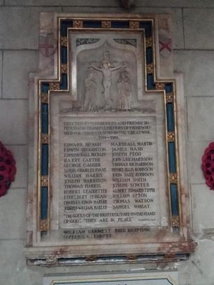 ERECTED BY PARISHIONERS AND FRIENDS IN/ PROUD AND THANKFUL MEMORY OF THOSE WHO/ DIED FOR THEIR COUNTRY IN THE GREAT WAR/ 1914-1919/ (Names)/ "THE SOULS OF THE RIGHTOUS ARE IN THE HAND/ OF GOD" "THEY ARE IN PEACE" WISDOM III. I & III/ (Names)