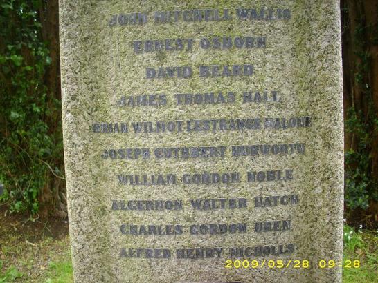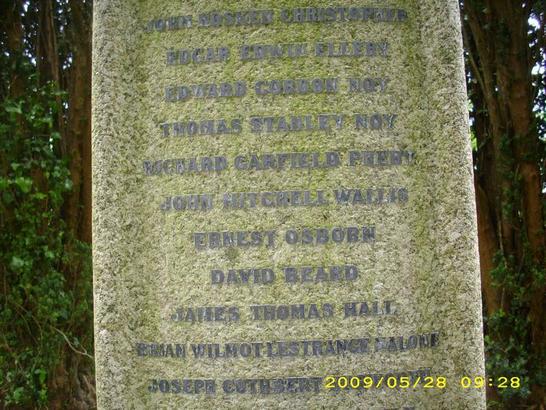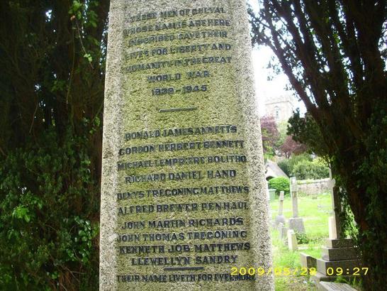 WW2- Donald James Annetts/ Gordon Herbert Bennett/ Michael Lempitre Bolitho/ Richard Daniel Hand/ Denys Tregoning Matthews/ Alfred Brewer Penhaul/ John Martin Richards/ John Thomas Tregoning/ Kenneth Job Matthews/ Llewellyn Sandry