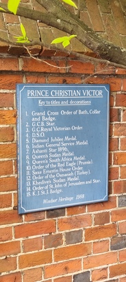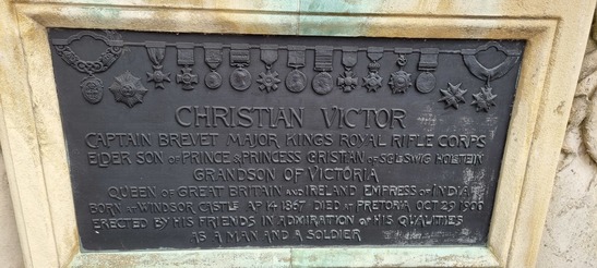 CHRISTIAN VICTOR / CAPTAIN BREVET MAJOR KINGS ROYAL RIFLE CORPS / ELDER SON OF PRINCE & PRINCESS CHRISTIAN OF SCHLESWIG HOLSTEIN / GRANDSON OF VICTORIA / QUEEN OF GREAT BRITAIN AND IRELAND EMPRESS OF INDIA / BORN AT WINDSOR CASTLE AP 14 1867 DIED AT PRETORIA OCT 29 1900 / EREXTED BY HIS FRIENDS IN ADMIRATION OF HIS QUALITIES / AS A MAN AND A SOLDIER
