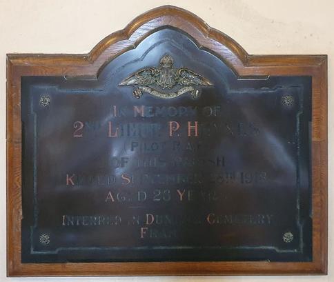 IN MEMORY OF/ 2ND. LIEUT. P. HAYNES/ (PILOT R.A.F.)/ OF THIS PARISH/ KILLED SEPTEMBER 28TH 1918/ AGED 26 YEARS./ INTERRED IN DUNKIRK CEMETERY/ FRANCE