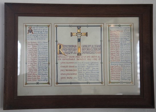 Centre: REMEMBER GRACEFULLY AND/ PRAYERFULLY BEFORE GOD THE/ FAITHFUL DEPARTED/ ESPECIALLY DEAR TO US AND ABOVE ALL/ THE IMPERISHABLE SACRIFICE 1914-1918 OF/ (5 names) ; Left Hand Side: AND TO THESE OUR/ Prayers let us add our thanksgivings for those/ who by the Mercy of GOD/ are all spared to us from active-/service in the War/ and especially of this Parish/ (46 names)