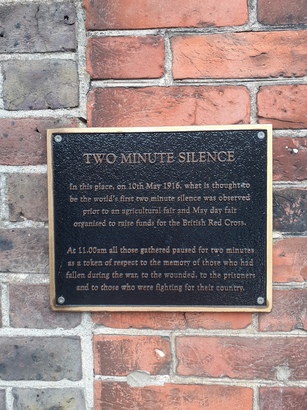Two Minute Silence In this place, on 10th May 1916, what is thought to be the world's first two minute silence was observed prior to an agricultural fair and May day fair organised to raise funds for the British Red Cross. At 11.00am all those gathered paused for two minutes as a token of respect to the memory of those who had fallen during the war, to the wounded, to the prisoners and to those who were fighting for their country.