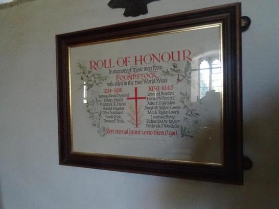 ROLL OF HONOUR/ IN MEMORY OF THOSE MEN FROM/ POUNDSTOCK/ WHO DIED IN TWO WORLD WARS/ 1914-1918/ (7 Names) 1939-1945/ (8 Names) REST ETERNAL GRANT UNTO THEM O LORD.