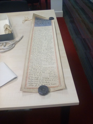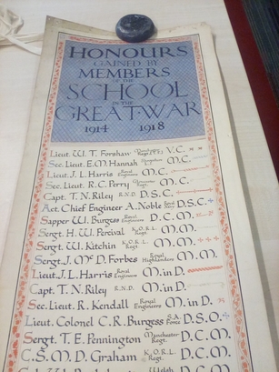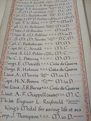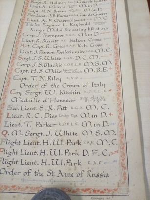 Lieut. W T Forshaw Manchester Regt V.C./ Sec Lieut E M Hannah Shropshire LI MC/ Lieut J L Harris Royal Engineers MC/ Sec Lieut R C Perry Gloucester Regt MC/ Capt T N Riley RND DSC/ Act. Chief Engineer A Noble Royal Navy DSC/ Sapper W Burgess Royal Engineers DCM/ Sergt H W Percival KORL Regt MM/ Sergt W Kitchin KORL Regt MM/ Sergt J McD Foorbes Royal Highlanders MM/ Lieut J L Harris Royal Engineers M in D/ Capt T N Riley RND M in D/ Sec Lieut R Kendall Royal Engineers M in D/ Lieut Colonel C R Burgess S.A. Force DSO/ Sergt T E Pennington Manchester Regt DCM/ C.S.M. D Graham KORL Regt DCM/ Cpl W. Postlethwaite Welsh Regt. DCM/ Sergt J McD Forbes Royal Highlanders Bar to MM/ Capt T N Riley RND 2nd Time M in D/ Cpl G.H Parkinson Divisional Artillery M in D/ Major J H Bowden AVC M in D/ Major R W Balfour RGA M in D/ C.S.M. M Newtin KORL Regt DCM/ Cpl C Postlethwaite RFA MM/ Capt H C Arnold RGA MC/ Lieut. R W Pickin Royal Engineers MC/ Pte C L Pittaway RAMC MM/ Sergt E Metcalfe RFA Croix de Guerre/ Sergt R Holman RGA Croix de Guerre/ Lieut A Morris Cheshire Regt M in D/ Capt. H N Brown 94th Labour Coy. M in D/ Sec Lieut J B Burns RGA Croix de Guerre/ Lieut A F Chappell (Master) RGA MC/ The late Engineer L Raybould Mercantile Marine/King's Medal for saving life at sea/ Corp J Thompson RGA M in D/ Lieut R Blewitt RE Italian Cross/ Act. Capt. R Grice RAF R F Cross/ Lieut J Pearson Postlethwaite RGA MC/ Sergt J S Waite RGA DCM/ Corp J S Blackie KORLR MSM/ Capt H S Mills Inspector of Army Schools MBE/ Capt T N Riley RND Order of the Crown of Italy/ Coy. Sergt W Kitchin KORLR/Medaille d'Honneur avec glaives d'argent/ Sec Lieut S R Pitt RGA MC/ Lieut. R Diss London Regt M in D/ Lieut T Parker KORLR M in D/ Q.M. Sergt J White MSM/ Flight Lieut H W Park RAF MC/ Flight Lieut H W Park DFC/ Flight Lieut H W Park RAF/Order of the St Anne of Russia