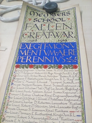 MEMBERS/OF THE/SCHOOL/WHO HAVE/FALLEN/IN THE/GREAT WAR/1914 1919/EXEGIT MONV/MENTVMAERE/PERENNIVS/[names]