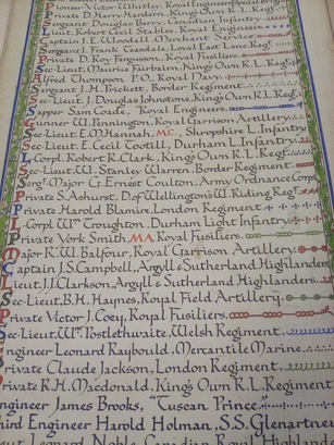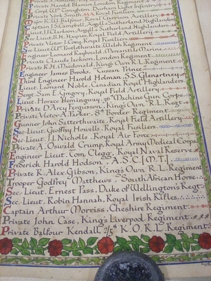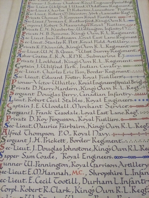 Lance Engineer Charles Jones HMS Bayano/ CQM Sergeant Hubert W Page King's Own R.L. Regt/ Gunner Wm. Forbes Trench Howitzer Battery RGA/ Sergeant F Postlethwaite King's Own R.L. Regt/ Private C Hassall Ellwood Liverpool Scottish/ Private Herbert Pearson Royal Sussex Regiment/ Sec. Lieut. Walton Noel Oliff-Lee South Staffs Regt/ Sec.Lieut. Frank Addison Royal Sussex Regiment/ Pioneer J Sydney Cheshire Royal Engineers [Special Brig.]/ Sec Lieut Wilfrid I Wood Middlesex Regiment/ Sec Lieut Charles D Roberton Lancashire Fusiliers/ Sec Lieut Robert M Stainton York & Lancaster Regt/ Private Thomas S Roseveare Royal Fusiliers/ Sec Lieut Norman E Rutherford Kings Own RL/ Corporal Robert S Haweridge Royal Fusiliers/ Private E H Kimberley Wellington Infantry NZ/ Private H B Symons Kings Own RL Regiment/ Sec Lieut Isaac Robinson Loyal East Lanc Regiment/ Sec Lieut Stanley R Pitt Royal Field Artillery/ Private K P Kinnish King's Own R.L. Regiment/ Sec Lieut W H B Gross West Surrey Regiment/ Asher Coates E.R.A. R.N.R. Submarine E7/ Private J Lockhead King's Own R.L. Regt./ Captain J. Wilfred Park Indian Cavalry/ Sec Lieut Charles Eric Pass Border Regiment/ Sec Lieut Edward Foster Royal Fusiliers/ Pioneer Victor Whitley Royal Engineers [Special Brig.]/ Private D Harry Hardern King's Own R.L. Regt./ Sergeant Douglas Berry, Canadian Infantry/ Lieut. Robert Cecil Stables Royal Engineers/ Captain J E Woodall Merchant Service/ Sergeant J Frank Teasdale Loyal East Lancs Regt/ Private D Roy Fergusson Royal Fusiliers/ Sec Lieut Maurice Fairbairn King's Own RLR/ Alfred Thompson P.O. Royal Navy/ Sergeant J H Prickett Border Regiment/ Sec Lieut J Douglas Johnstone King's Own R.L./ Sapper Sam Coade Royal Engineers/ Gunner W Pennington Royal Garrison Artillery/ Sec Lieut E M Hannah MC Shropshire L Infantry/ Sec Lieut E Cecil Tootill Durham L Infantry/ L Corpl Robert R Clark King's Own R.L. Regt/ Sec Lieut W Stanley Warren Border Regiment/ Sergt Major G Ernest Coulton Army Ordnance Corps/ Private S Ashurst, D of Wellingtons W Riding Regt/ Private Harold Blamire London Regiment/ L Corpl Wm. Troughton Durham Light Infantry/ Private York Smith MA Royal Fusiliers/ Major R W Balfour Royal Garrison Artillery/ Captain J S Campbell Argyll & Sutherland Highlanders/ Lieut J J Clarkson Argyll & Sutherland Highlanders/ Sec Lieut B H Haynes Royal Field Artillery/ Private Victor J Coey Royal Fusiliers/ Sec Lieut Wm Postlethwaite Welsh Regiment/ Engineer Leonard Raybould Mercantile Marine/ Private Claude Jackson London Regiment/ Private R H MacDonald King's Own RL Regiment/ Engineer James Brooks "Tuscan Prince"/ Third Engineer Harold Holman SS Glenartney/ Lieut Leonard Noble Canadian Royal Highlanders/ Sergt Sam E Gregory Royal Field Artillery/ Lieut Horace Hemingway 36th Machine Gun Corps/ Private D'Arcy Fergusson King's Own R.L Regt/ Private Victor A Parker 8th Border Regiment/ Gunner John Satterthwaite Royal Field Artillery/ Sec Lieut Geoffrey Howells Royal Fusiliers/ Sec Lieut JJ Nicholls Royal Air Force/ Private A Oswald Crump Royal Army Medical Corps/ Engineer Lieut Tom Clegg Royal Naval Reserve/ Frederick Harold Hodson ASC [MT]/ Private R Alex Gibson King's Own R L Regt/ Trooper Godfrey Matthews South African Horse/ Sec Lieut Ernest Pass Duke of Wellington's Regt/ Sec Lieut Robin Hannah Royal Irish Rifles/ Captain Arthur Morriss Cheshire Regiment/ Private John Case King's Liverpool Regiment/ Private Balfour Kendall 2 5th K.O.R.L. Regiment