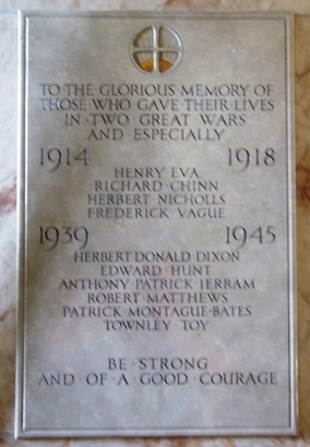 WW1- Henry Eva/ Richard Chinn/ Herbert Nicholls/ Frederick Vague; WW2- Herbert Donald Dixon/ Edward Hunt/ Anthony Patrick Herram/ Robert Matthews/ Patrick Montague Bates/ Townley Toy