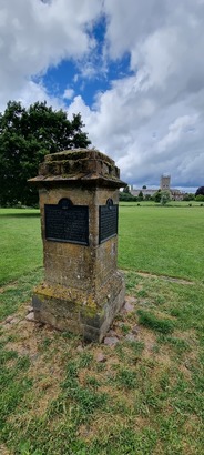 THESE FIELDS KNOWN AS THE/ VINEYARDS ARE PART OF THE/ HISTORIC BATTLEGROUND OVER/ WHICH WAS FOUGHT THE DECISIVE/ BATTLE OF THE WARS OF THE ROSES/ ON THE 4TH MAY 1471 WHEN/ EDWARD PRINCE OF WALES WAS/ SLAIN. THEY WERE PURCHASED BY/ THE CORPORATION OF TEWKESBURY/ IN 1929.