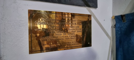 IN MEMORY OF / A DEAR FIREND AND GALLANT COMRADE / CHARLES OAKES BATES BLEWITT / CAPTAIN RIFLE BRIGADE / WHO FELL IN ACTION AT BLOOD RIVER POORT / SOUTH AFRICA 17TH SEPT 1901 / AGED 26 YEARS / SON OF MAJOR GENERAL CHARLES BLEWITT/ LATE COMMANDING THIS REGT DISTRICT / ERECTED BY HIS COMRADES IN GOUGHS / WITH WHOM HE WAS SERVING