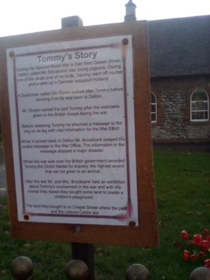 Tommy's Story/During the Second World War a man from Queen Street/Dalton called Mr Brockbank had racing pigeons. During/one of the races one of his birds, Tommy, went off course/and ended up in German occupied Holland.// A Dutchman called Dik Divers looked after Tommy before/sending it on it's way back to Dalton.// Mr Divers named the bird Tommy after the nickname/given to the British troops during the war.// Before releasing Tommy he attached a message to the/ring on it's leg with vital information for the War Effort.// When it arrived back in Dalton Mr Brockbank passed the/coded message to the War Office. The information in the/message stopped a major disaster.// After the war Mr and Mrs Brockbank held an exhibition/about Tommy's involvement in the war and with the/money they raised they bought some land to create a/Children's playground.// The land they bought is on Chapel Street where the park/and the Leisure Centre are.