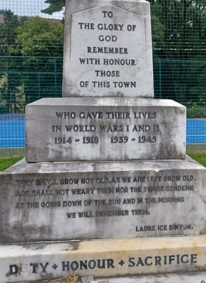 TO/THE GLORY OF/GOD/REMEMBER/ WITH HONOUR/THOSE/OF THIS TOWN/WHO GAVE THEIR LIVES/IN WORLD WAR I AND II/ 1914-1918 1939-1945/THEY WILL GROW NOT OLD AS WE ARE LEFT GROW OLD/AND AGE NOT WEARY THEM AS THE YEARS CONDEMN/AT THE GOING DOWN OF THE SUN AND IN THE MORNING/WE WILL REMEMBER THEM./ LAWRENCE BINYON./DUTY+HONOUR+SACRIFICE