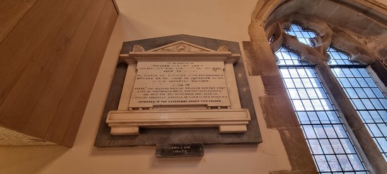 IN MEMORIAM OF / WILLIAM NEWTON ESQRE / WHO DEPARTED THIS LIFE MAY THE 10TH 1866 / AGED 82 YEARS / WHO SERVED HIS COUNTRY WITH DISTINGUISHED / BRAVERY ON THE FIELD OF WATERLOO WHERE / HE WAS SEVERELY WOUNDED / ALSO OF / JOYCE THE BELOVED WIFE OF WILLIAM NEWTON ESQRE / LATE OF NORTHFIELD HOUSE, WOTTON GLOUCESTERSHIRE / SHE DIED THE 29TH SEPTEMBER 1861 AGED 78. / A SINCERE CHRISTIAN, AND FULL OF FAITH IN HER REDEEMER / INTERRED IN THE CATACOMBES UNDER THIS CHURCH