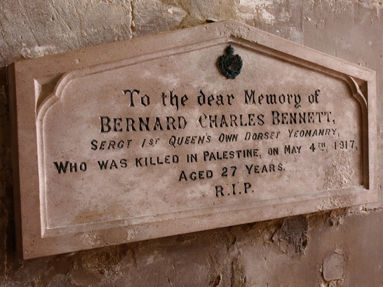 To the dear Memory of/BERNARD CHARLES BENNETT,/SERGT. 1ST QUEEN'S OWN DORSET YEOMANRY,/WHO WAS KILLED IN PALESTINE, ON MAY 4TH, 1917,/AGED 27 YEARS./R.I.P.