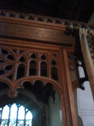 The Interpretation Notice-These curtains are old and fragile. Please do not touch./These curtains are nearly 80 years old and in very fragile condition. They are vulnerable both to the/abrasion of being touched, and to the natural oils and chemicals or dirt that we carry on our skin./The dedication board above reads: [as below]/ In 1915, during the First World War, Annie Bindon Carter worked as a volunteer at Wharncliffe War/Hospital, Middlewood, Sheffield. She taught convalescent patients the art of stencilling as a pastime. She/encountered many servicemen who had suffered the loss of limbs, and found ways to help them do/stencilling as well. From these beginnings sprang Painted Fabrics Ltd, incorporated in 1923. The company/was based in Sheffield, and gave many disabled men gainful employment in the production of/luxurious clothing and hand-crafted pieces, ranging from cushion covers to specially commissioned/wedding dresses. Commercially they also produced altar frontals and a variety of furnishings for private/houses, including curtains for Princess Mary's Boudoir on her wedding day.//From 1926, regular sales of the company's work were held in a shop on Crag Brow in Bowness.// The curtains depict two crusader-style soldiers facing each other carrying a staff bearing the motto/'Deus vult' (God wills). By 2015, nearly 80 years old, the curtains showed serious signs of their age./They were in a delicate state and in urgent need of conservation and protection.//With the support of fund-raising, a contribution from the Windermere branch of the Royal British Legion,/and individual donors, an experienced textile conservator was employed. The curtains have been cleaned,/repaired and conserved. They have been re-hung in such a way as to enable their beauty to be enjoyed.; The Screen-These curtains were made and presented to Windermere Parish Church War Memorial Chapel/ by War Disabled Craftsmen employed by Painted Fabrics Limited in appreciation of the/ support given to their/work by the residents of Windermere and district during the past ten years. June 7th 1936.