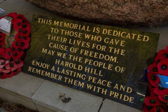 THIS MEMORIAL IS DEDICATED / TO THOSE WHO GAVE / THEIR LIVES FOR THE CAUSE OF FREEDOM. / MAY WE THE PEOPLE OF / HAROLD HILL / ENJOY A LASTING PEACE AND / REMEMBER THEM WITH PRIDE