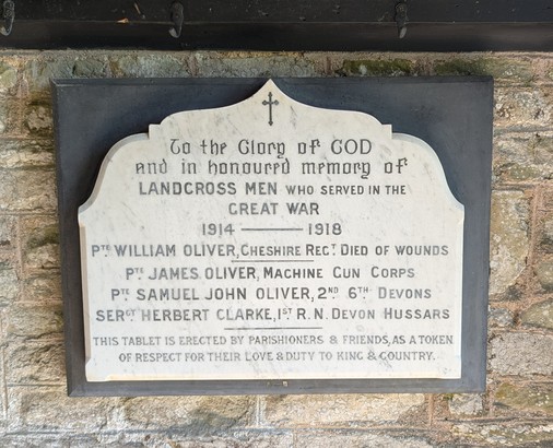 + / To the Glory of GOD / and in honoured memory of / LANDCROSS MEN WHO SERVED IN THE / GREAT WAR / 1914 - 1918 / (4 NAMES) / THIS TABLET IS ERECTED BY PARISHIONERS & FRIENDS, AS A TOKEN / OF RESPECT FOR THEIR LOVE AND DUTY TO KING & COUNTRY.