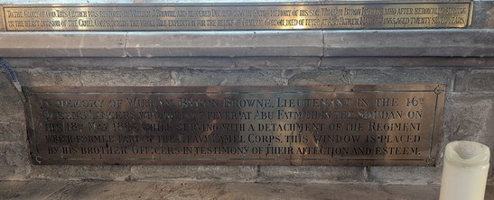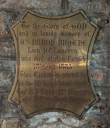 (Plaque 1:) To the Glory of GOD / and in loving memory of / Wm BYRON BROWNE / Lieut 16th Lancers / who died at Abu Fatmeh / 18th May 1885 / This Window is erected by / his two life long & devoted friends / Capt H.V. Burn 21st Hussars / & Capt C.R. Burn Royal Dragoons (Plaque 2:) TO THE GLORY OG GOD. THIS CHURCH WAS RESTORED BY WILLIAM J. BROWNE AND REOPENED DEC 25TH 1886, IN LOVING MEMORY OF HIS SON, WILLIAM BYRON BROWNE, WHO AFTER HEROICALLY SERVING / IN THE HEAVY DIVISION OF THE CAMEL CORPS, DURING WHOLE NILE EXPEDITION FOR THE RELIEF OF GENERAL GORDON, DIED OF FEVER AT ABU FATMEH, MAY 18TH 1885, AGED TWENTY SEVEN YEARS. (Plaque 3:) IN MEMORY OF WILLIAM BYRON BROWNE, LIEUTENANT IN THE 16TH. QUEEN'S LANCERS, WHO DIED OF FEVER AT ABU FATMEH IN THE SOUDAN ON / THE 18TH MAY 1885, WHILE SERVING WITH A DETACHMENT OF THE REGIMENT / WHICH FORMED PART OF THE HEAVY CAMEL CORPS, THIS WINDOW IS PLACED / BY HIS BROTHER OFFICERS IN TESTIMONY OF THEIR AFFECTION AND ESTEEM.