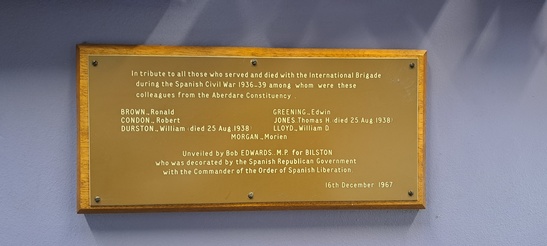NO PASARAN / IN TRIBUTE TO ALL THOSE WHO SERVED AND DIED WITH THE INTERNATIONAL BRIGADE / DURING THE SPANISH CIVIL WAR 1936-39 AMONG WHOM WERE THESE / COLLEAGUES FROM THE ABERDARE CONSTITUENCY / (Names) / UNVEILED BY BOB EDWARDS, MP FOR BILSTON / WHO WAS DECORATED BY THE SPANISH REPUBLICAN GOVERNMENT / WITH THE COMMANDER OF THE ORDER OF SPANISH LIBERATION. / 16TH DECEMBER 1967