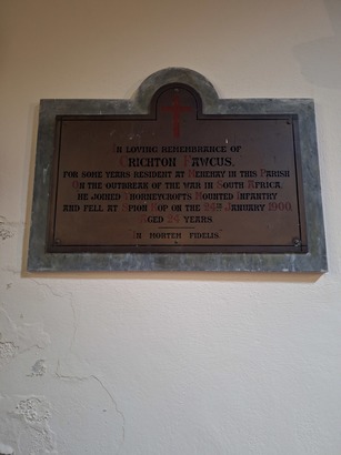 IN LOVING REMEMBRANCE OF/ CRICHTON FAWCUS/ FOR SOME YEARS RESIDENT AT MENEHAY IN THIS PARISH/ ON THE OUTBREAK OF WAR IN SOUTH AFRICA/ HE JOINED THORNEYCROFT'S MOUNTED INFANTRY/ AND FELL AT SPION KOP ON THE 24TH JANUARY 1900/ AGED 34 YEARS/ IN MORTEM FIDELIS
