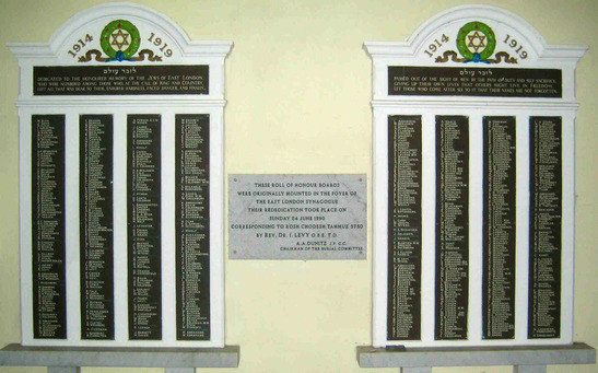First tablet: Dedicated to the honoured memory of the Jews of East London/ who were numbered among those who, at the call of King and Country/ left all that was dear to them, endured hardness, faced danger and finally/ Second tablet: passed out of the sight of men by the path of duty self sacrifice/ giving up their own lives that others might live in freedom/ Let those who come after see to it that their names are not forgotten.
