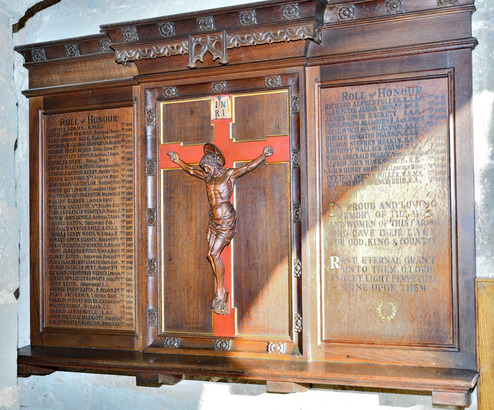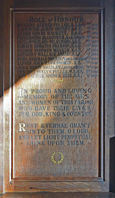Left panel: ROLL OF HONOUR/[names]; Right panel: ROLL OF HONOUR/[names]/ IN PROUD AND LOVING/ MEMORY OF THE MEN/ AND WOMEN OF THIS PARISH/ WHO GAVE THEIR LIVES/ FOR GOD, KING & COUNTRY.// REST ETERNAL GRANT/ UNTO THEM, O LORD,/ AND LET LIGHT PERPETUAL/ SHINE UPON THEM