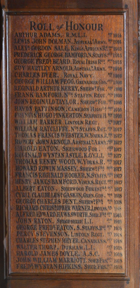 WW1- ARTHUR ADAMS, R.M.L.I. OCT. 1914/ LEWIS JOHN DOLMAN, AUSTRALN. ARMY. DEC. 1914/ ALEXR. GORDON SALE, KINGS AFRICAN RS. MAR. 1915/ FREDERICK GEORGE BAMFORD, N. STAFFS. JULY. 1915/ GEORGE FREDK. BEARD, ROYAL IRISH RFS. MAR. 1915/ GUY HARTLEY ARNOLD, AUSRALN. ARMY. APR. 1916/ CHARLES DYER, ROYAL NAVY. MAY. 1916/ GEORGE WILLIAM PEGG, GRENADIER GDS. JULY. 1916/ REGINALD ARTHUR KERRY, SHERWD. FOR. JULY. 1916/ FRANK BAMFORD, NTH. STAFFS. REGT. AUG. 1916/ JOHN REGINALD TAYLOR, SHERWD. FOR. SEP. 1916/ HAYDN PATTINSON, CAMERON HIGHLS. SEPT. 1916/ FRANCIS HUGO PINKERTON, SEAFORTH H. NOV. 1916/ WILLIAM PARKER, LINCOLN REGT. APR. 1917/ WILLIAM RATCLIFFE, NTH. STAFFS, REGT. MAY. 1917/ THOMAS FRANCIS WEBSTER, W. YORKS. R. MAY 1917/ RUPERT JOHN ARNOLD, AUSTRALN. ARMY. JULY. 1917/ HAROLD EATON, SHERWOOD FOR. JULY. 1917/ REGINALD WYSTAN ASTLE, K.O.Y.L.I. AUG. 1917/ THOMAS HENRY WOOD, W. YORKS, R. SEP. 1917/ HOWARD EDWIN MASSEY, SHERWD. FRS. SEPT. 1917/ FRANCIS REGINALD HOOKER, N. STAFFS. SEPT. 1917/ HENRY JAMES BAMFORD, YORKS. REGT. SEPT. 1917/ ALBERT EATON, SHERWOOD FORESTRS. OCT. 1917/ CYRIL CLAUDE LEND. GASKIN, GREN GDS. MAR. 1918/ GEORGE CHARLES DENT, SHERWD. FRS. MAR. 1918/ RICHARD CHRISTOPHER WARNER, LINCOLNS. APR. 1918/ ALFRED EDWARD HAWKSWORTH, SHER. FRS. JUN. 1918/ JOHN EATON, SHROPSHIRE L.I. JUN. 1918/ GEORGE FREDK. EATON, S. STAFFS. REGT. JUN. 1918/ PERCY STEVENSON, LINCOLN REGT. OCT. 1918/ CHARLES STEPHEN MEYER, CANADIANS. OCT. 1918/ WALTER THORP, DURHAM L.I. OCT. 1918/ HAROLD JAMES DOYLE, A.S.C. OCT. 1918/ JOHN WILLIAM MARRIOTT, SHER FORS. OCT. 1918/ FREDK. WYSTAN HIPKINS, SHER. FRS. OCT. 1918; WW2- RICHARD ALFRED FULLER, R.A.S.C. JUN. 1940/ ALAN PETER JAMES GRUNDY, R.A.F. AUG. 1941/ JAMES HENRY HACKETT, R.A.F. MAR. 1942/ FREDK. JOSEPH SEABOURNE, A&S.HIGHLS. AUG. 1942/ CECIL WM. KELSEY-WILKINSON, A.A.C. APL. 1943/ HORACE HORATIO PEARSON, R.A.F. JUN. 1943/ GEORGE STEPHEN MEAKIN, R.A.F. OCT. 1943/ ANTHONY WALLACE ADAMS, R.A.F. JUL. 1944/ NIGEL REGINALD PEARCE, YORKS DRAGOONS. SEPT. 1944/ ALFRED JOHN HAWKSWORTH, R.E. NOV. 1945/ JOHN HENRY SMEDLEY, LINCOLN REGT. MAR. 1946/ CYNTHIA EVELYN FULLER, W.R.N.S. MAR. 1946/ GUY PATRICK SPENCE REID, R.A. MAY. 1940