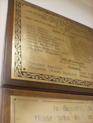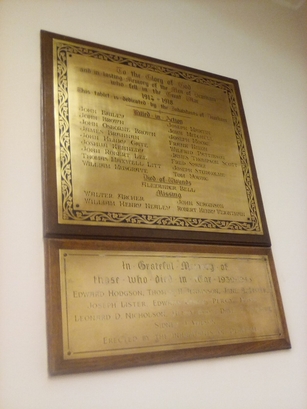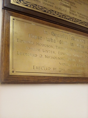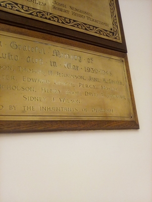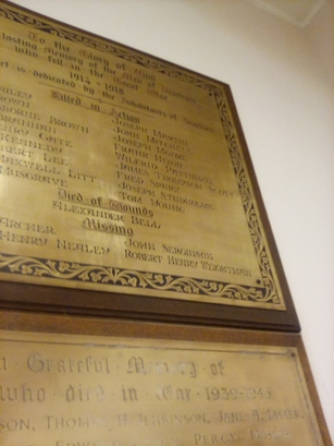 WW1-Column 1- JOHN BAILEY/JOHN BROWN/JOHN OSBORNE BROWN/JAMES BRANNAN/JOHN HENRY GATE/JOSHUA KENNEDY/JOHN ROBERT LEE/THOMAS MAXWELL LITT/WILLIAM MUSGRAVE WW1-Column 2- JOSEPH MARTIN/JOHN MITCHELL/JOSEPH MOORE/FRANK NIXON/WILFRID PATTINSON/JAMES THOMPSON SCOTT/FRED SPARK/JOSEPH STUDHOLME/TOM YOUNG/DIED OF WOUNDS- ALEXANDER BELL; MISSING-Column 1-WALTER ARCHER/WILLIAM HENRY NEALEY; Column 2-JOHN SERGINSON/ROBERT HENRY WEIGHTMAN; WW2-EDWARD HODGSON, THOMAS H. JENKINSON, JANE A.LISTER/JOSEPH LISTER, EDWARD LYNCH, PERCY MOSSOP/LEONARD B. NICHOLSON, HENRY ROOK, DAVID T. SANDHAM/ SYDNEY J. WILSON