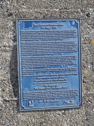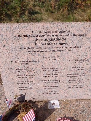 Stone of Remembrance: This Memorial was unveiled/ on the 9th August 2004 and is dedicated to the men of/ PT SQUADRON 34/ United States Navy/ Who died in action off Noirmont Point headland/ on the morning of 9th August 1944/ (Names...) Plaque: Naval Battle off Noirmont Point/ 9th August 1944/ During the early morning hours of 9th August, 1944, a naval engagement took place just off/ Noirmont Point between PT Squadron 34 of the United States Navy operating from the newly/ liberated port of Cherbourg in Normandy, and a convoy of German vessels escorted by the/ heavily armed 46th Minesweeping Flotilla of the German Navy based in the German occupied/ Channel Islands. The convoy, sailing under cover of darkness, was carrying a battery of heavy/ field guns destined to reinforce the defences on the east coast of Jersey./ Battle was joined in thick fog as the convoy rounded La Corbiere, and continued along the/ south coast, culminating off Noirmont Point when the PT 509, having rammed an escorting/ minesweeper, the MT 4626, finally went down taking fourteen of her fifteen man crew with her./ A further two USN seamen from the PT 503 were also lost in the action. The German losses/ were three seamen from the 46th Minesweeping Flotilla and one soldier from Engineer/ Battalion 319. The convoy got through to St. Helier and the guns were emplaced on the east/ coast, from where they could fire on American forces deployed on the Cotentin peninsula. One/ of these guns is now on display in this emplacement./ Of the sixteen American seamen who lost their lives that morning, three were washed up on/ the island and buried with full military honours at Howard Davis Park in St. Helier, on 15th/ August 1944. A fourth body was picked up by an Allied seaplane in St. Ouen's Bay on 10th/ August. In 1946, their bodies were transferred to a US Cemetery in Normandy. Nine/ American bodies were never recovered, the sea off Noirmont Point becoming their final/ resting place. For the United States Navy PT Boat service, this was the greatest loss of life in/ any single engagement during World War Two./ The four German dead were buried in St. Brelade churchyard, but removed to the German/ military cemetery at Mont-des-Huisnes, near Mont-St-Michel, France in 1962. Their names and ranks are: (names...) The Memorial 9th August 1944-9th August 2004 The memorial is dedicated to the men of PT Squadron 34, United States Navy, who gave their/ lives during that engagement of 60 years ago. Around the main Memorial stone, are arranged/ sixteen smaller granite stones, each representing one USN serviceman who died in the action./ The Memorial is located on the site of the former Battery Lothringen Mess Hut, and faces out/ across the area of sea water where the action took place and the final resting place of the PT 509./