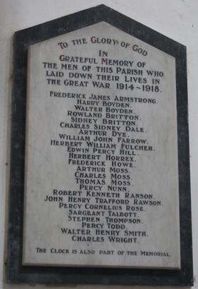 TO THE GLORY OF GOD/ IN/ GRATEFUL MEMORY OF/ THE MEN OF THIS PARISH WHO/ LAID DOWN THEIR LIVES IN/ THE GREAT WAR 1914-1918/ (NAMES)/ THE CLOCK IS ALSO PART OF THE MEMORIAL
